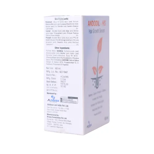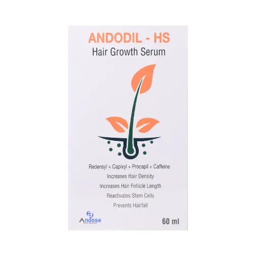Andodil HS Hair Growth Serum is a scientifically formulated solution for hair thinning and excessive hair fall. Powered by advanced hair-restoring actives—Redensyl (3%), Capixyl (5%), Procapil (3%), and Caffeine (0.5%)—it works at the follicular level to activate dormant hair follicles, improve scalp microcirculation, and strengthen hair from the roots. The lightweight, non-greasy serum absorbs quickly, making it ideal for daily use without leaving residue. Suitable for all hair types, it is designed for both men and women seeking denser, fuller, and healthier hair.