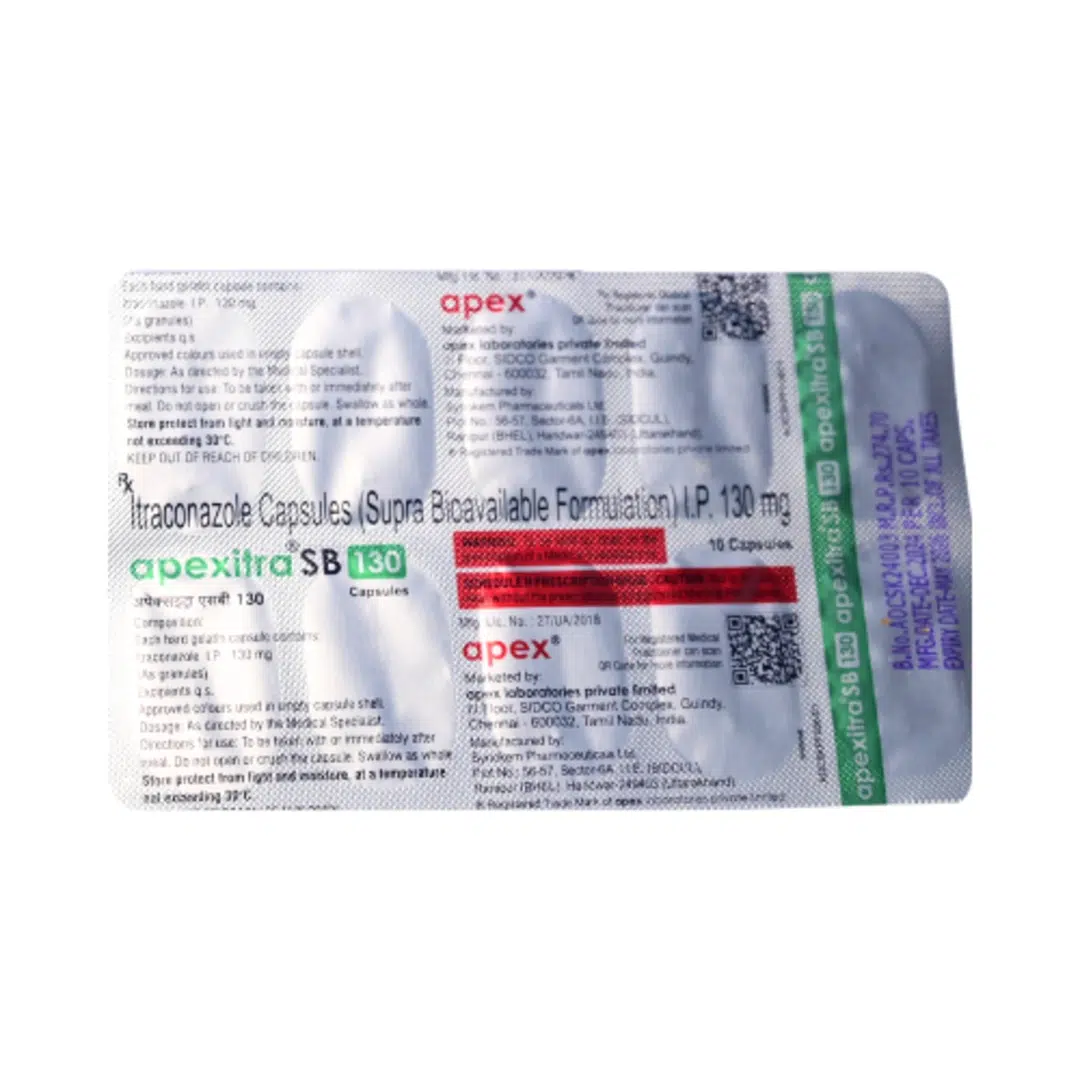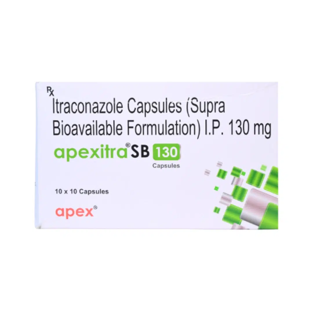 Apexitra SB 130 mg Capsule is an oral antifungal medicine containing Itraconazole 130 mg, designed to treat a broad range of fungal infections affecting the skin, nails, mouth, vagina, and internal organs such as the lungs. It works by weakening the fungal cell membrane, stopping growth and spreading.