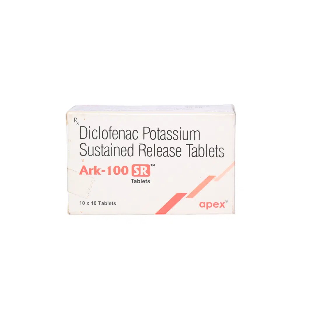Ark 100mg Tablet SR contains Diclofenac Sodium 100mg (Sustained Release), a potent non-steroidal anti-inflammatory drug (NSAID) that provides long-lasting relief from pain, swelling, and inflammation. It is commonly prescribed for arthritis, ankylosing spondylitis, osteoarthritis, muscle pain, sprains, and back pain. The sustained-release formulation ensures steady medication levels in the body, offering extended relief with reduced dosing frequency. Always use under medical supervision.