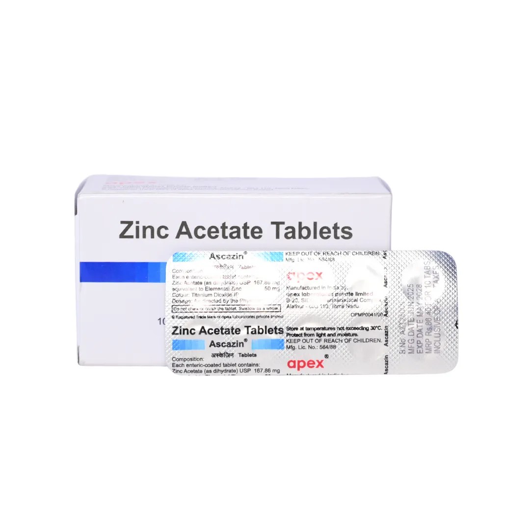 Ascazin Tablet is a high-quality zinc supplement formulated with Zinc Acetate (50 mg), an essential trace mineral that plays a vital role in immune function, wound healing, skin health, and overall growth. It also aids in reducing acne severity, supports enzymatic functions, and can be used as an adjuvant in the management of Wilson’s disease to help control copper levels. This tablet is ideal for individuals with zinc deficiency or increased zinc requirements due to illness, poor diet, or specific health conditions.