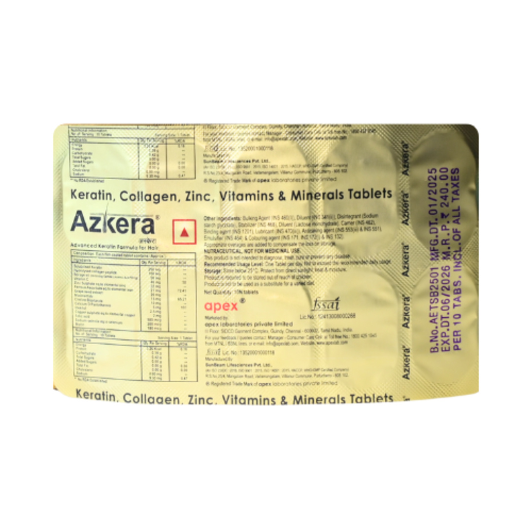 Regular intake of Azkera Tablets helps restore hair strength, improve shine, and protect against environmental damage, making them an ideal supplement for both men and women.