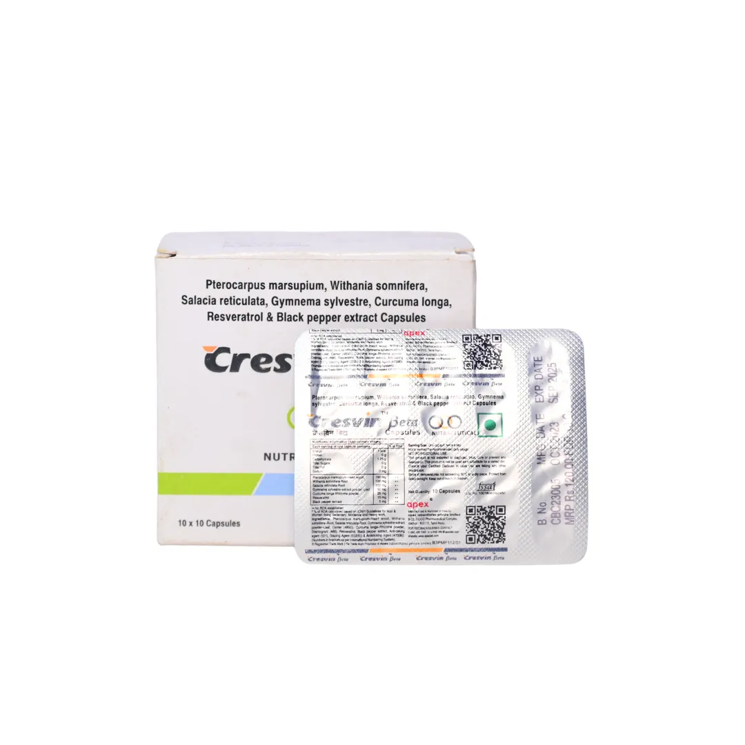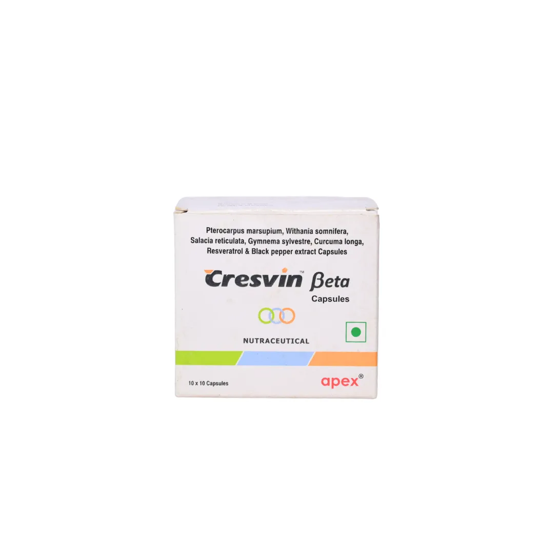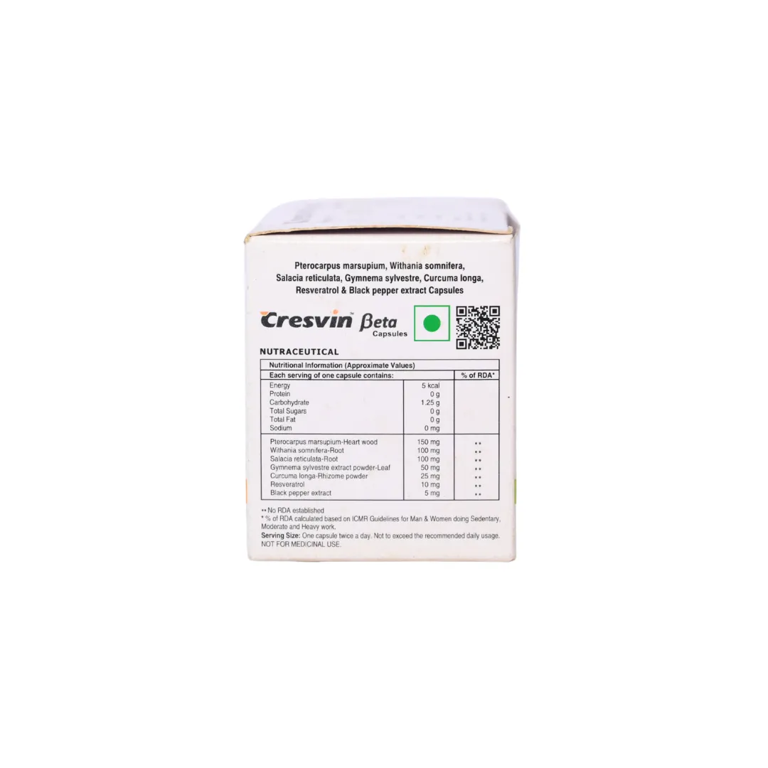 Cresvin Beta Capsule is a vegetarian herbal formulation enriched with Ashwagandha, Turmeric, Grape Seed Extract, Gymnema, Pterocarpus, Salacia, and Black Pepper. This antioxidant-rich blend helps strengthen immunity, protect cells from oxidative stress, improve bone health, boost metabolism, and support skin vitality. Ideal for individuals looking for daily wellness, it combines traditional herbal wisdom with modern nutritional science to enhance overall energy, strength, and wellbeing.