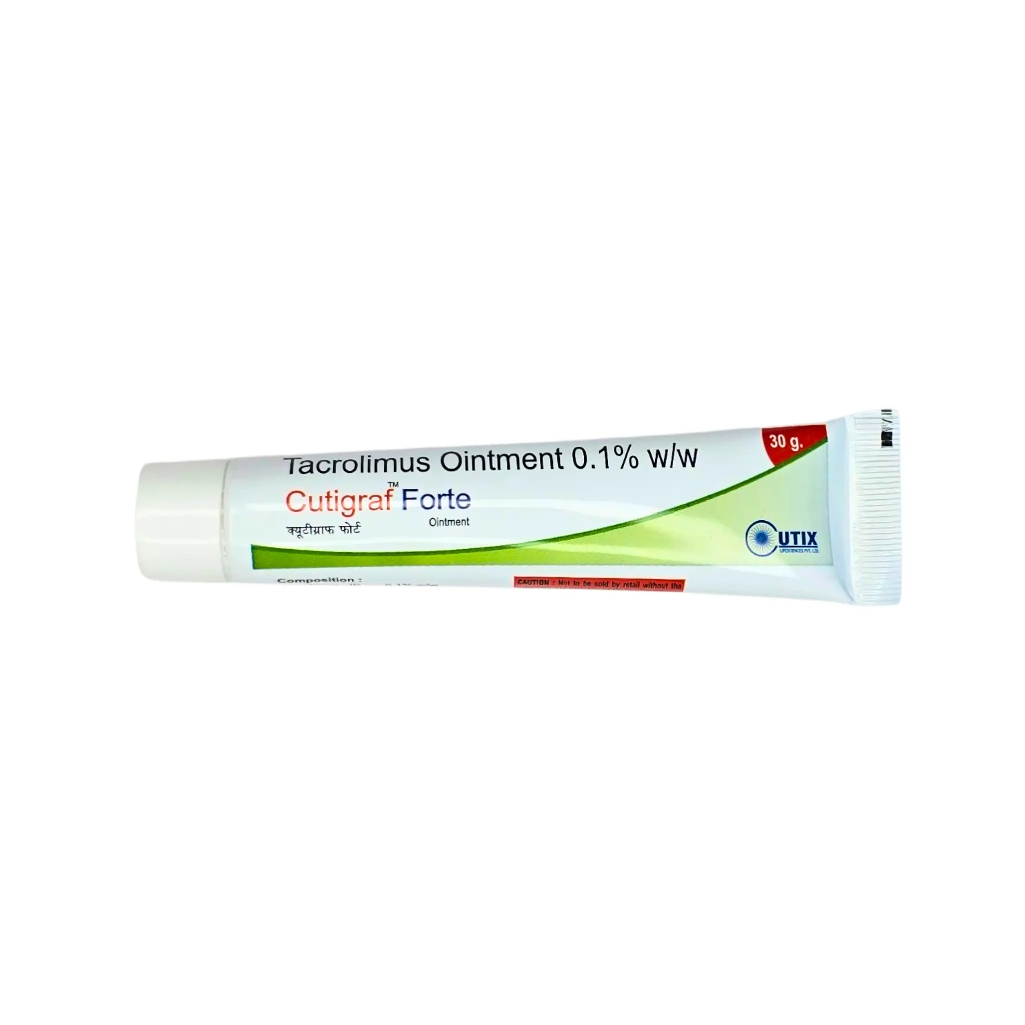 Cutigraf Forte Ointment is a prescription topical dermatological medicine formulated with tacrolimus 0.1%, an immunomodulating agent used in the management of moderate to severe atopic dermatitis (eczema). It works by suppressing overactive immune responses in the skin that cause redness, itching, swelling, and inflammation.