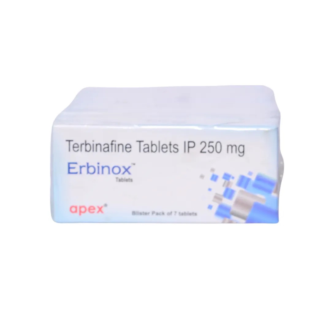 Erbinox 250 mg Tablet is a prescription antifungal medicine containing Terbinafine Hydrochloride 250 mg, used to treat a variety of fungal skin and nail infections including athlete’s foot, jock itch, ringworm, and onychomycosis. Terbinafine belongs to the allylamine class of antifungals and works by inhibiting ergosterol synthesis in fungal cell membranes, effectively stopping fungal growth and aiding complete infection clearance. Completing the full prescribed course helps prevent recurrence and resistance.