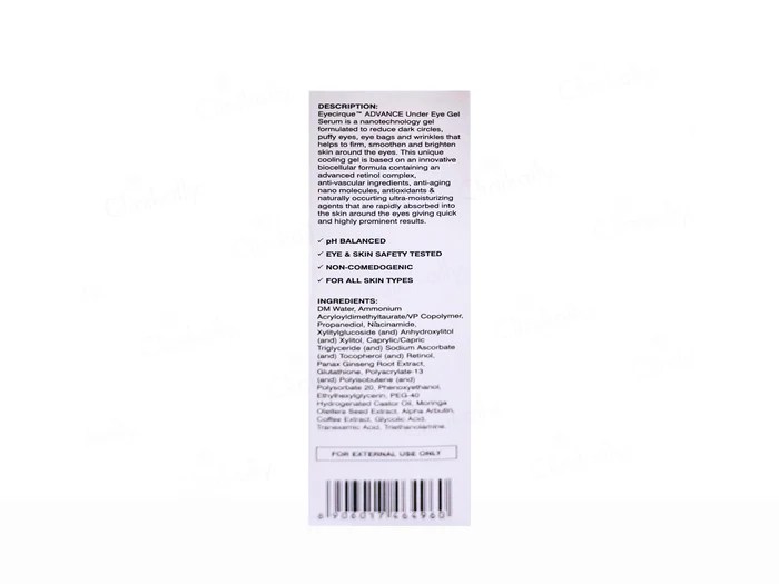 Eyecirque Advance Under Eye Gel Serum is a dermatologist-tested formula designed to refresh and revive the delicate under-eye area. It features a high-performance blend of caffeine, peptides, hyaluronic acid and vitamins to target multiple concerns like puffiness, dark circles, dryness and fine lines. With its non-greasy texture and fast-absorbing action, it offers a soothing cooling effect while hydrating and strengthening the skin barrier. Suitable for daily use by all skin types including sensitive skin.