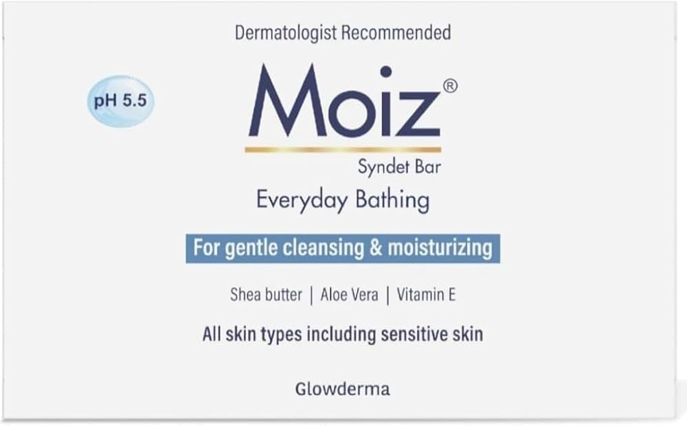 Moiz Syndet Bar — A soap-free cleansing bar recommended by dermatologists for sensitive and dry skin Made with skin-friendly emollients, it delivers mild yet effective cleansing that won’t disturb the skin’s natural moisture barrier. Its pH-balanced formula is also designed to keep skin hydrated, soft, and free of irritation.