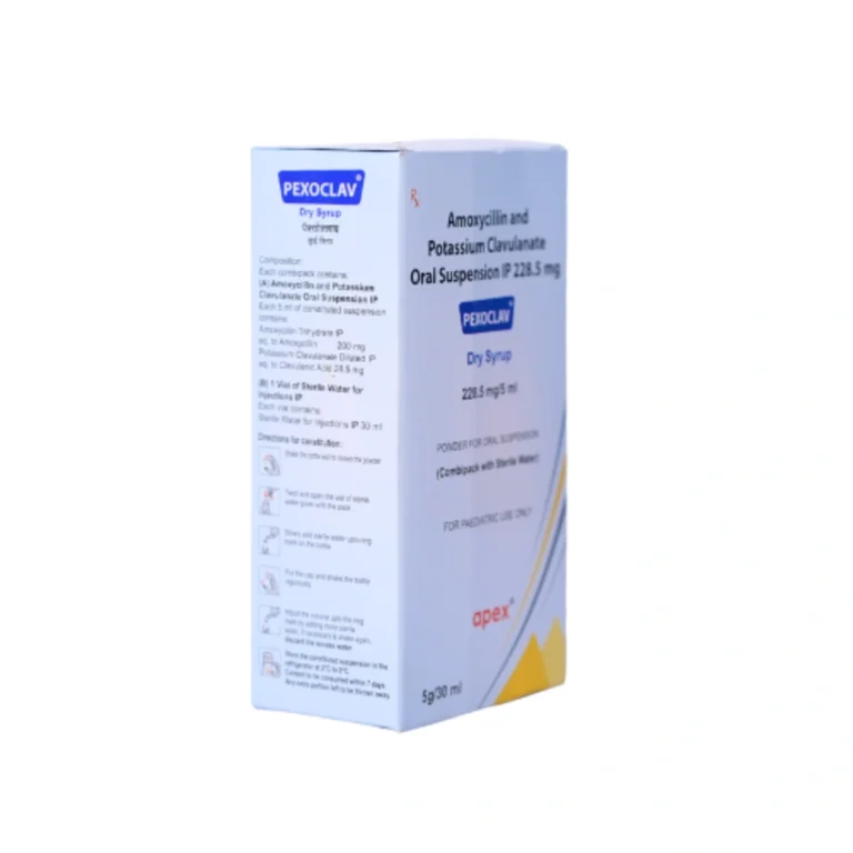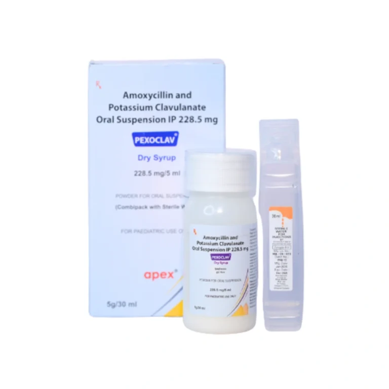 Pexoclav 200 mg/28.5 mg Dry Syrup is a broad-spectrum pediatric antibiotic containing Amoxicillin (200 mg) and Clavulanic Acid (28.5 mg) per dose. This combination effectively treats bacterial infections of the ear, nose, throat, chest, lungs, urinary tract, skin, soft tissues, bones, and joints. Clavulanic acid helps prevent bacterial resistance by protecting Amoxicillin from enzymatic breakdown, making the medicine more effective against resistant bacteria.