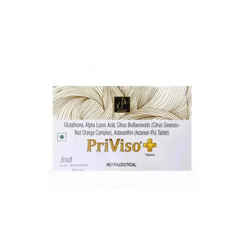 PriViso Plus Tablet is a premium skin health and antioxidant support supplement that combines L Glutathione Alpha Lipoic Acid Grape Seed Extract and Astaxanthin. This advanced formula is specially designed to promote skin lightening and cellular detoxification while enhancing energy levels and immune response. It helps combat oxidative stress reduce pigmentation and support healthy aging. PriViso Plus is often recommended by dermatologists for individuals managing skin concerns such as melasma dark spots or dull skin tone. Regular use contributes to a radiant clearer and healthier complexion.