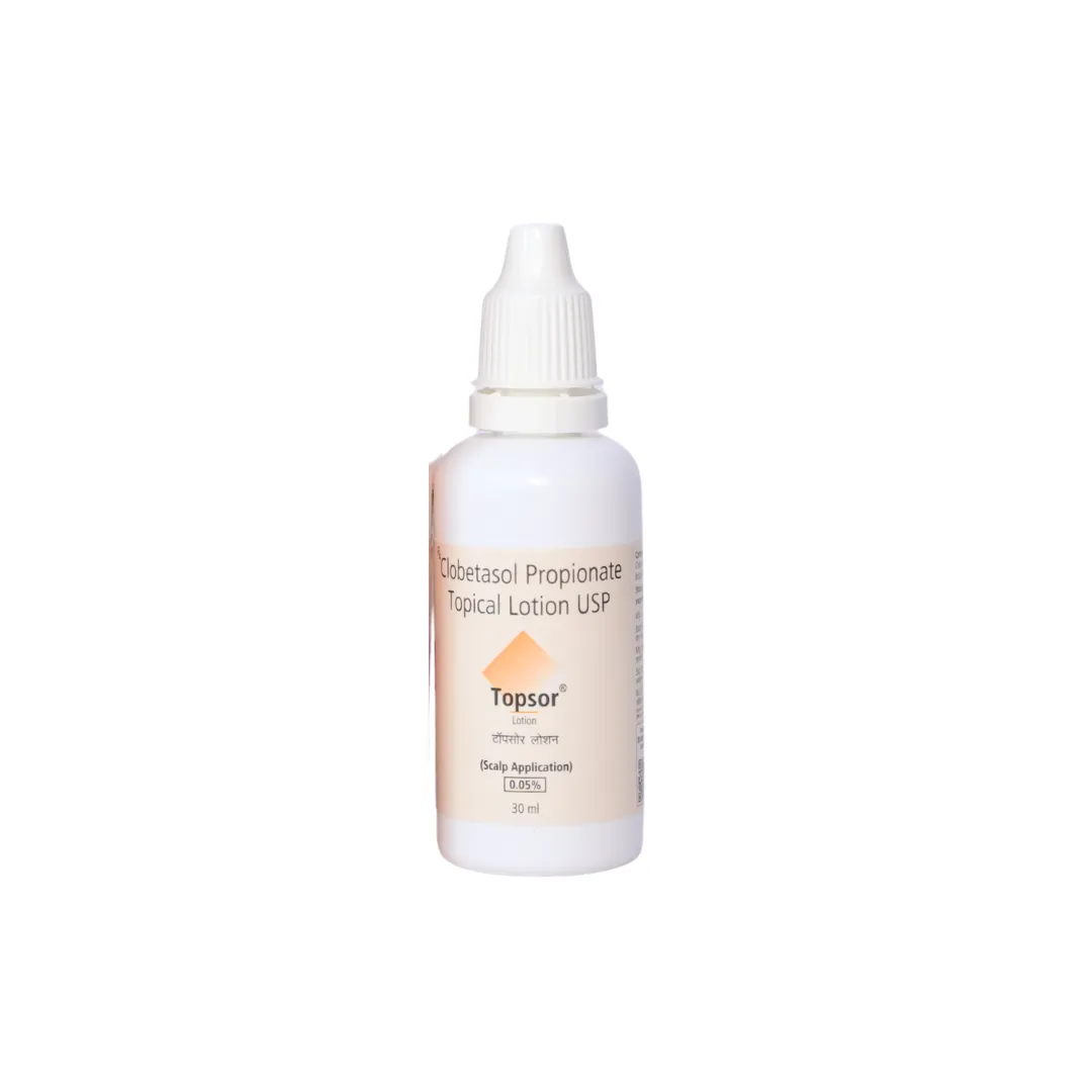Topsor Lotion is a high-potency topical corticosteroid containing Clobetasol Propionate 0.05%, formulated to treat inflammatory skin conditions such as eczema, dermatitis, psoriasis, and allergic skin reactions. It works by reducing inflammation, redness, swelling, and itching, providing rapid relief and improving skin appearance. Recommended for short-term use under medical supervision, it should be applied directly to affected areas in a thin layer for effective results.