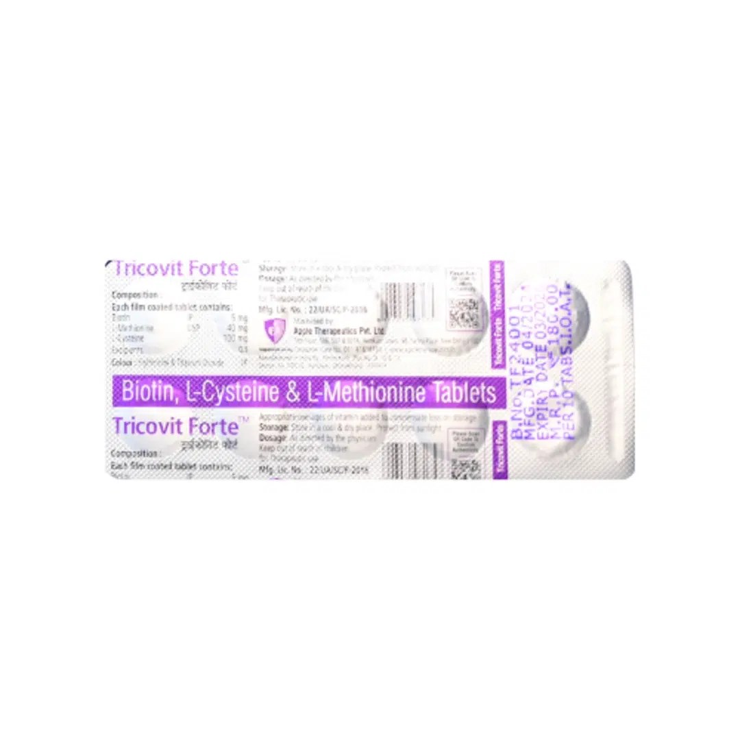 Tricovit Forte Tablet is a specialized nutritional supplement designed to support healthy hair growth, strengthen brittle nails, and enhance skin vitality. Formulated with Biotin, L-Cysteine, and L-Methionine, it works by improving keratin production, boosting hair shaft strength, and reducing breakage. This formula is beneficial for those experiencing nutritional hair loss, nail fragility, or biotin deficiency, and it also helps manage conditions like seborrheic dermatitis.
