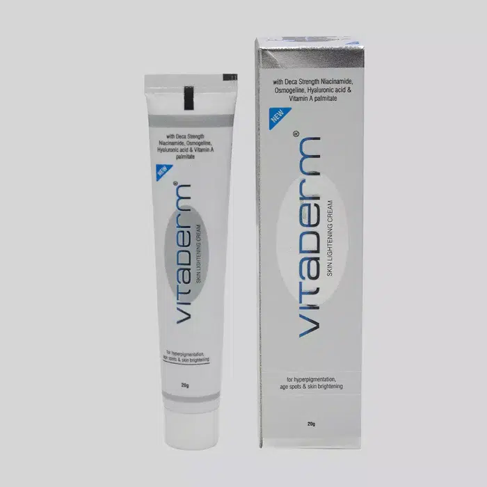 Vitaderm Skin Lightening Cream is a non-steroidal, dermatologist-recommended skin brightening solution designed to address pigmentation, dark spots, melasma, sun damage, and uneven skin tone. Its advanced formula blends Niacinamide (Vitamin B3), Vitamin C, Wheat Germ Oil, Shea Butter, and botanical extracts to help inhibit melanin production, fade discoloration, and improve skin clarity. Packed with antioxidants and moisturizers, it restores a healthy glow while keeping the skin hydrated and soft.