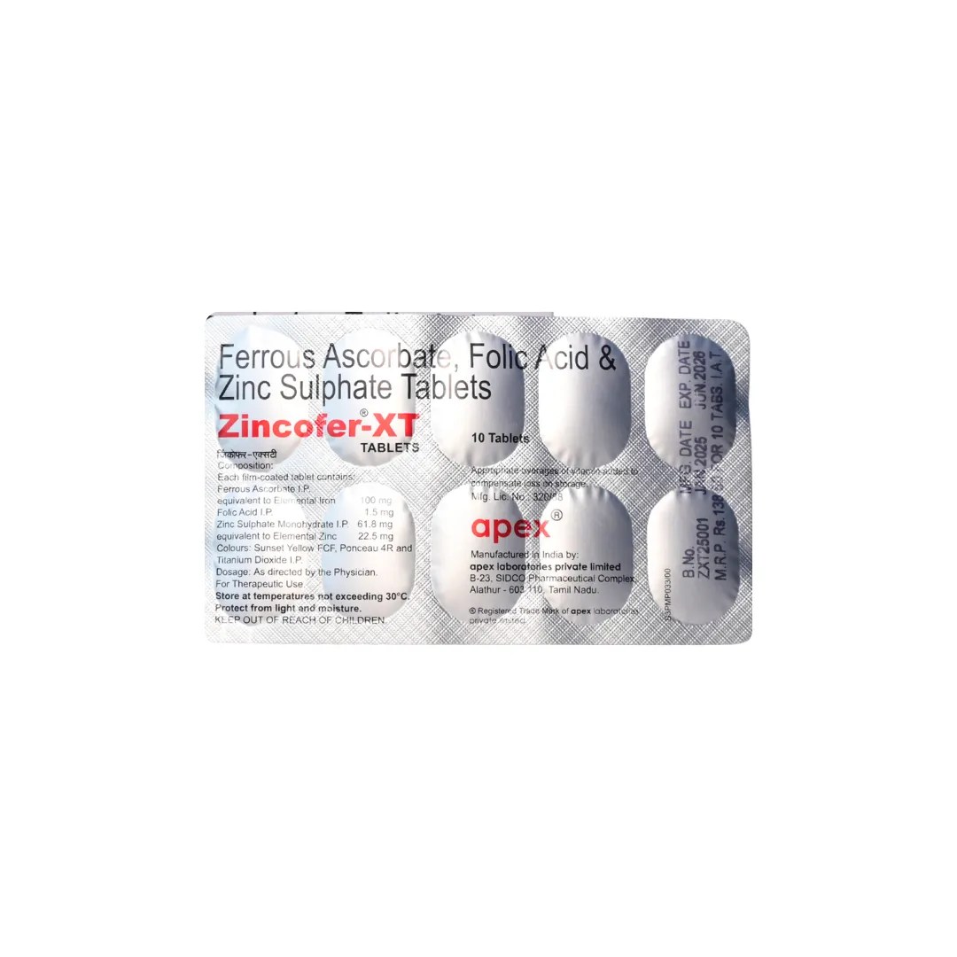 Zincofer-XT Tablet is a scientifically formulated supplement containing Ferrous Ascorbate (Iron), Folic Acid, and Zinc Sulphate Monohydrate to help manage iron deficiency anemia and boost overall health. It supports red blood cell production, improves hemoglobin levels, enhances energy, and strengthens immunity. This combination is especially beneficial during pregnancy, breastfeeding, recovery from illness or surgery, and in cases of increased nutritional demand.